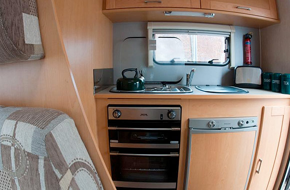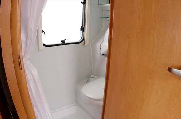 The rear of the Motorhome has the luxury of a full oven and separate grill as well as a gas hob. The fridge incorporates a freezer box which ensures that you can be self sufficient. The toilet and shower are also at the back of the Motorhome.